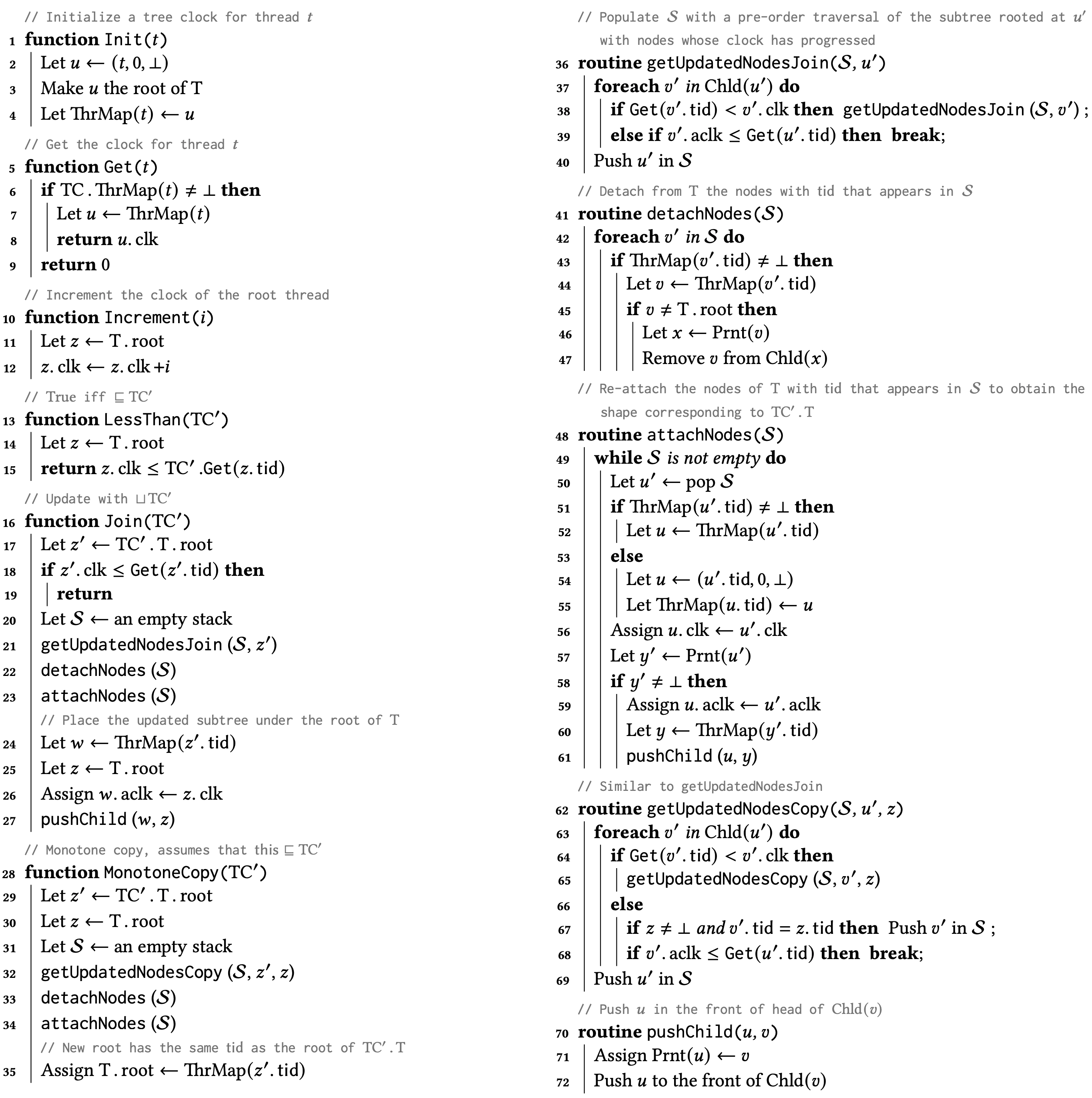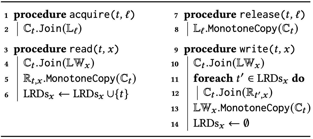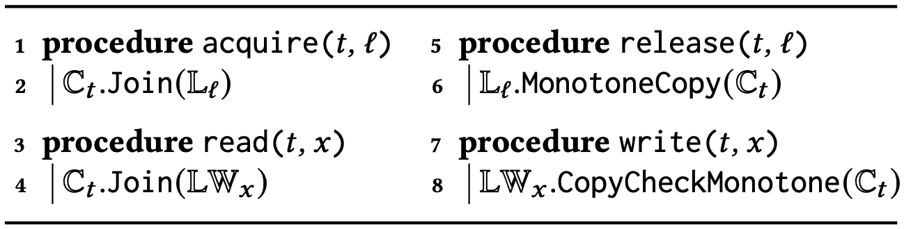 happens-before アルゴリズム. 補題 1 に照らして、HB に基づく競合検出はベクトルタイムスタンプの観点から \(\le_{\sf HB}^\sigma\) 半順序を構築し、これを用いて競合を検出する。\(\le_{\sf HB}^\sigma\) を構築するためのコアアルゴリズムを Algorithm 1 に示す。このアルゴリズムはすべてのスレッド \(t \in {\rm Thrds}\) に対してベクトルクロック \(\mathbb{C}_t\) を維持し、すべてのロック \(\ell\) に対して同様のベクトルクロック \(\mathbb{C}_\ell\) を維持する。イベント \(e=\langle t,{\sf op}\rangle\) を処理するときに更新 \(\mathbb{C}_t.{\sf Increment}(t,1)\) を実行するが、これは暗黙的なものでありAlgorithm 1 には示されていない。さらに \({\rm op} = {\sf acq}(\ell)\) または \({\rm op} = {\sf rel}(\ell)\) の場合、アルゴリズムは対応する手続きを実行する。\(e\) の HB-タイムスタンプは \(e\) が処理された直後に \(\mathbb{C}_{\sf tid}(e)\) に格納された値になる。