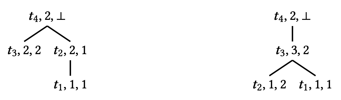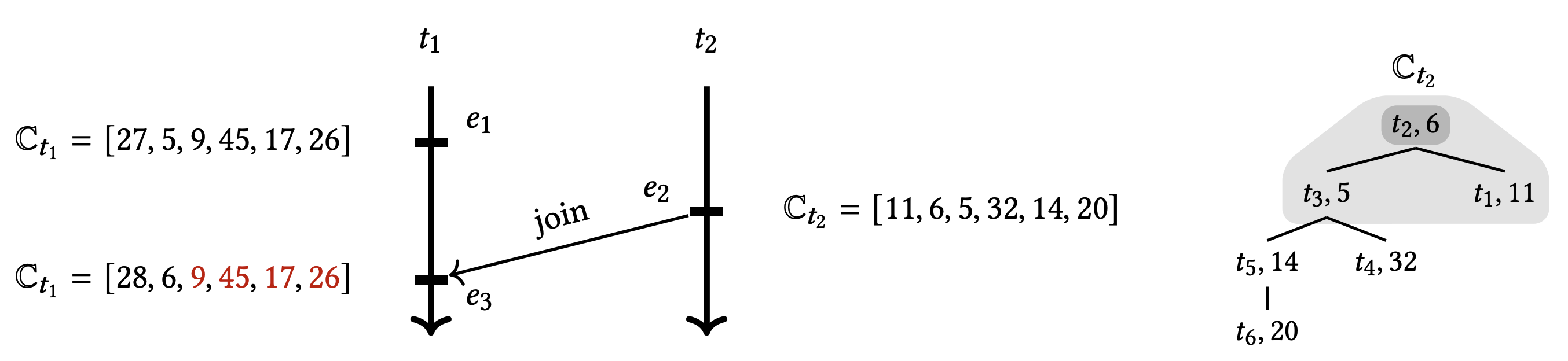 結合前、\(t_4\) は \(t_3\) と比較して \(t_2\) のより新しいビューを持っているため、スレッド \(t_3\) がスレッド \(t_2\) を介して世界について知っているすべての情報を認識している。したがって結合を実行するときに 2 つのクロック内のスレッド \(t_1\) に対応するコンポーネントを調べる必要がない。ツリークロックはこのような追加情報を維持することによりベクトルタイムスタンプのいくつかの成分を検査することを回避し、劣線形更新を行うことができる。
