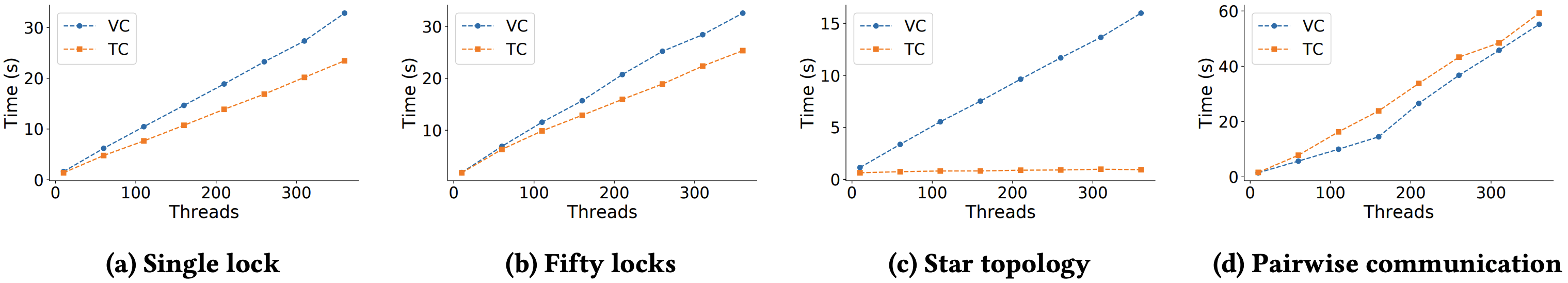 スケーラビリティ. ツリークロックのスケーラビリティについてより深く理解するために、通信パターンを一定に保ちながらスレッド数とロック数のパラメータを制御してカスタムベンチマークで一連の制御実験を行った。各トレースは 1,000 万のイベントで構成され、スレッド数は 10〜360 の間で変化する。各トレースは、ランダムに選択されたスレッドがランダムに選択されたロック \(l\) に対し、\(acq(l)\) のあとに \(rel(l)\) という 2 つの連続した操作を実行する方法で生成されている。我々は 4 つの方法を検討した: (a) すべてのスレッドが単一の共通ロックを介して通信する場合 (single lock)、(b) (a) と似ているが、ロックが 50 個あり、スレッドの 20% が残りのスレッドと比較して 5 倍の確率で操作を実行する場合 (50 locks, skewed)、(c) \(k-1\) クライアントスレッドがスレッドごとに専用のロックを介して単一のサーバスレッドと通信する場合 (star topology)、(d) (a) と似ているが、スレッドのペアごとに専用のロックを介して通信する場合 (pairwise communication)。得られた結果を Figure 10 に示す。シナリオ (a) の設定ではツリークロックがベクトルクロックよりも一定の割合で高速化する様子を示している。シナリオ (b) でロック数を増やすと、スレッド通信の独立性が高まりツリークロックの利点はわずかに減少している可能性がある。スレッドのサブセットは他のスレッドよりアクティブであるため、タイムスタンプはスレッドを通じて頻繁に交換され、この設定でもツリークロックが高速となる。シナリオ (c) はツリークロックが繁栄するケースを表している。ベクトルクロックにかかる時間はスレッドの数とともに増加するがツリークロックの場合は一定のままである。これは、すべてのスレッドが他のスレッドの状況を認識しているにもかかわらず、スター型トポロジーにより平均してすべてのツリークロックのエントリにしか影響しないことを意味しているためである。直感的にはスター型通信トポロジーはツリーの形状に (ほぼ) スター型の自然な影響を与えてこの効果をもたらす。最後に、シナリオ (d) はすべてのスレッドのペアが互いに通信可能で、通信はスレッドのペアごとに固有のロックを介して行われるため、ツリークロックの最悪ケースを表している。このパターンではツリーロックの利点が向こうになり、複雑さが増すと全体的な速度が低下する。ただしこの最悪のシナリオでもツリークロックとベクトルクロックの差は比較的小さいままである。
