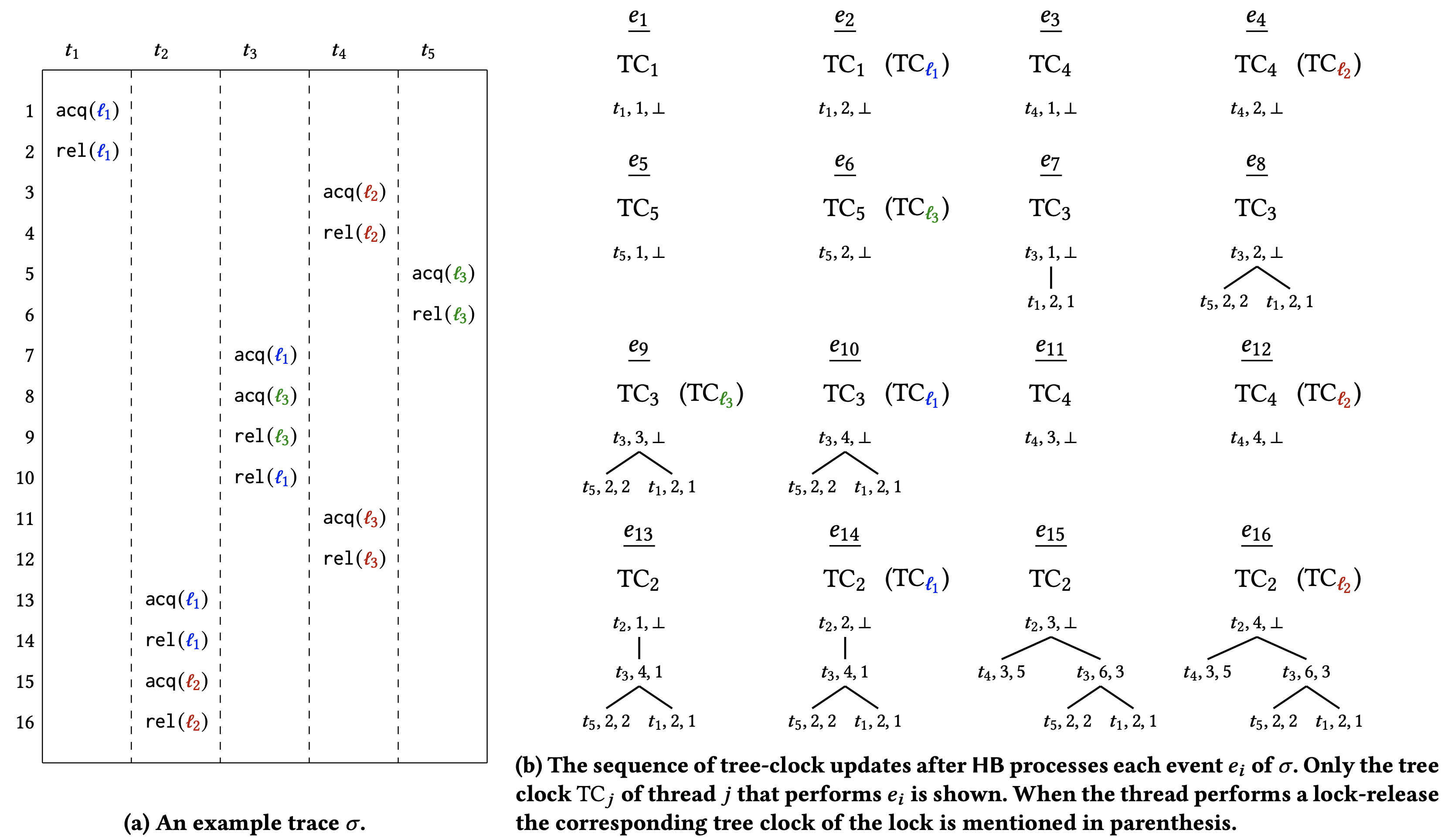 ベクトルクロックと同様に、ツリークロックは他のスレッドのイベントに関するスレッドの知識を記録するベクトルタイムスタンプを表す。したがって各スレッド \(t\) について、ツリークロックは \(t\) の最後の既知のローカル時刻を記録する。ただしフラットなベクトルクロックとは異なりツリークロックはこの情報を階層的に維持する。ノードはスレッドのローカル時刻を保存し、ツリー構造はこの情報が中間スレッドを通じてどのように推移的に取得されたかを記録する。次の例では \({\sf acq}(\ell)\), \({\sf rel}(\ell)\) というシーケンスを表すために \({\sf sync}(\ell)\) という操作を使用する。