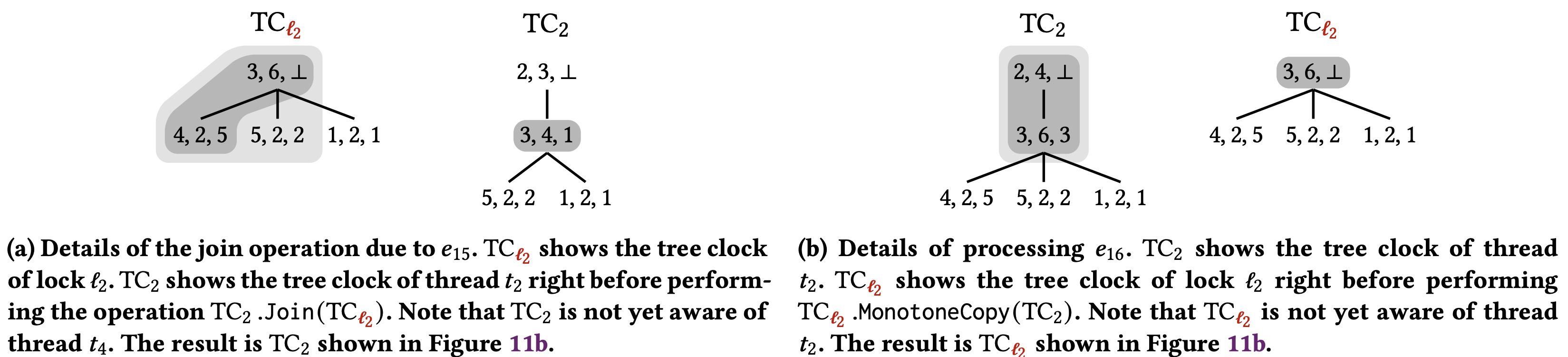 Figure 11 はトレース \(\sigma\) でのアルゴリズム 3 の実行例を示しており、実行中にクロックがどのように成長するかを示している。この図はスレッドのツリークロック \(\mathbb{C}_t\) を示している。ロック \(\mathbb{C}_\ell\) のツリークロックはロック開放イベントを処理した後のロック \(\mathbb{C}_\ell\) の単なるコピーである (図内の括弧に示されている)。Figure 12 は \(\sigma\) の最後のイベントに対する \({\sf Join}\) 操作と \({\sf MonotoneCopy}\) 操作の詳細である。
