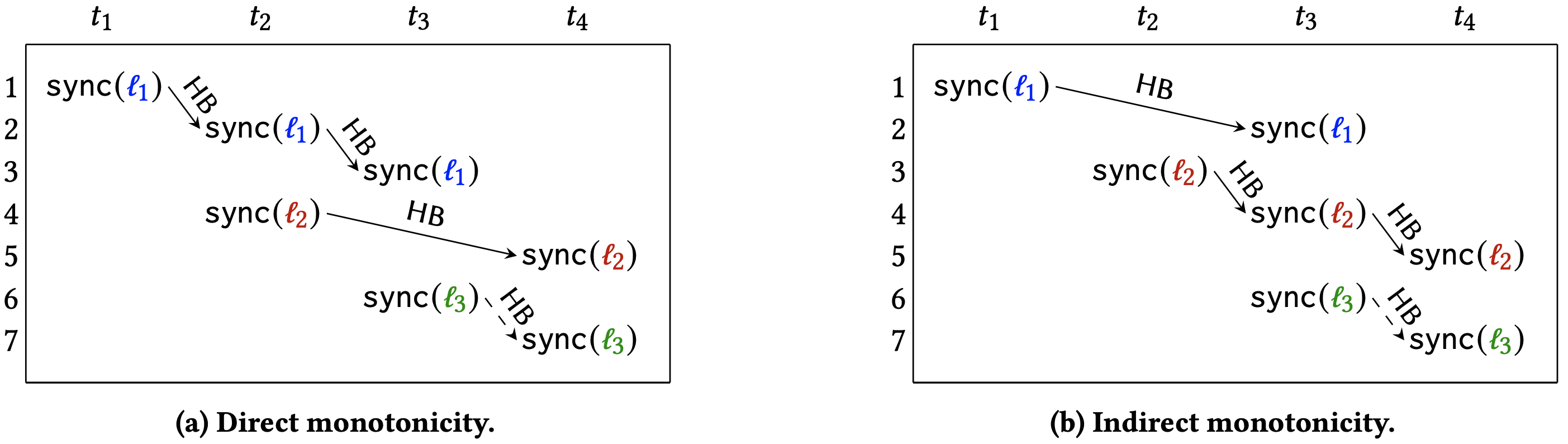1. 直接単調性 (direct monotonicity). Algorithm 1 のようなベクトルクロックベースのアルゴリズムは、直感的にすべてのスレッドに関するスレッド \(t\) の知識を取得するベクトルクロック \(\mathbb{C}_t\) を維持することは前に述べた。しかしこの情報がどのように取得されたかは保持していない。例で示すように、この情報がどのように取得されたかに関する知識は結合操作で活用できる。Figure 2a に示すトレース \(\sigma\) の HB 半順序の計算を考える。イベント \(e_7\) では \(e_6 \le_{\sf HB}^\sigma\) (Figure 2a の破線) であるため、スレッド \(t_4\) はスレッド \(t_3\) を通じてトレース中のイベントに関する情報を推移的に学習する。これはスレッド \(t_3\) のクロック \(\mathbb{C}_{t_3}\) と結合することで達成される。ベクトルクロックを使用したこのような欠乏には、長さ 4 の 2 つのベクトルの点単位の最大値を取得する必要があるため、4 つのステップを要する。
