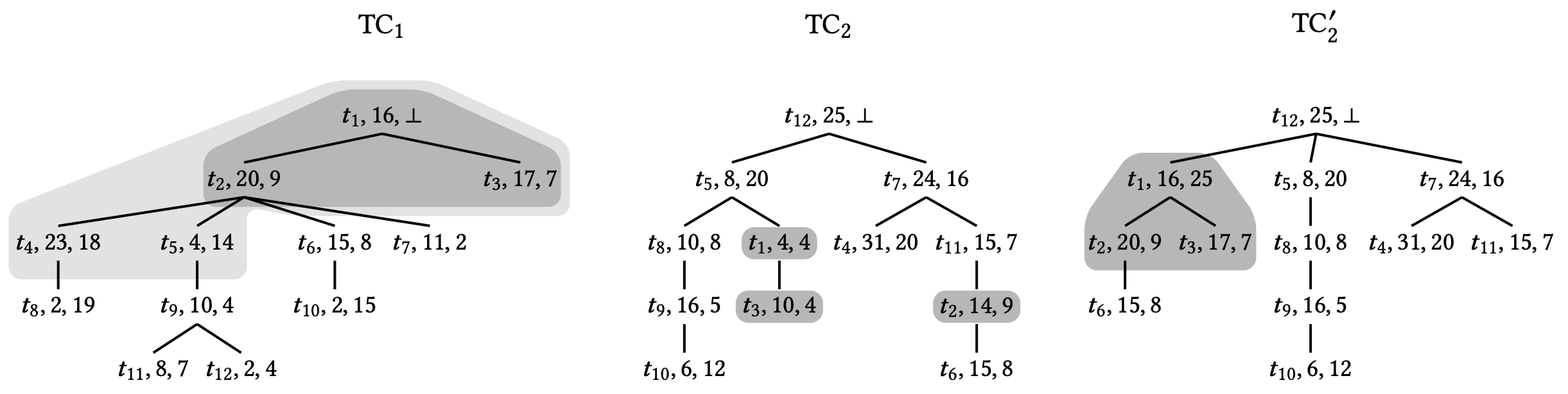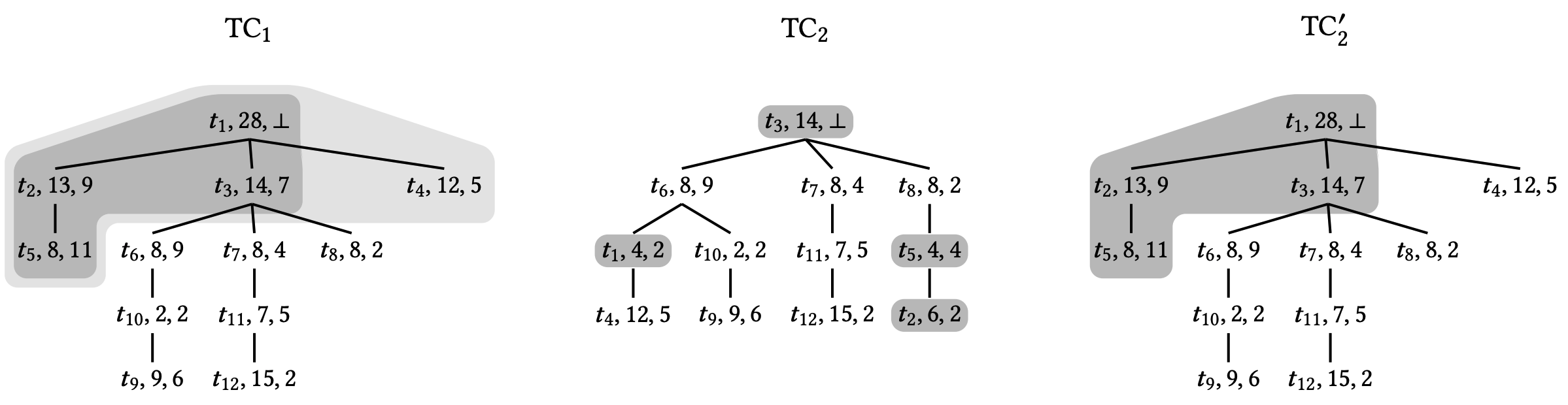この問題を軽減するために我々はツリークロックと呼ばれるベクトル時間を保持するための新しい階層ツリー状データ構造を導入する。ツリーのノードはベクトルクロックのエントリと同様にローカルクロックをエンコードする。さらに、ツリー構造は中間スレッドを介してどのクロックが学習されたかを推移的に補足する。Figure 1 (右) は \(\mathbb{C}_{t_2}\) のベクトル時間をエンコードした (単純化) ツリークロックである。スレッド \(t_3\) をルートとするサブツリーは、\(t_2\) が \(t_3\) を介して \(t_4\), \(t_5\), \(t_6\) の現在時刻を推移的に (transitively) 学習したことを表している。結合操作 \(\mathbb{C}_{t_1} \leftarrow \mathbb{C}_{t_1} \sqcup \mathbb{C}_{t_2}\) を実行するために \(\mathbb{C}_{t_2}\) のルートから開始し、次のようにツリーを横断する。現在のノード \(u\) が与えられると、\(u\) は \(t_1\) に知られていないスレッドの時刻を表す場合に限り (if and only if) \(u\) の子ノードに進む。したがってこの例では、結合操作はツリー全体にはアクセスせずツリーの明るい灰色の領域のみにアクセスして結合を計算するため、結合操作の劣線形実行時間をもたらす。