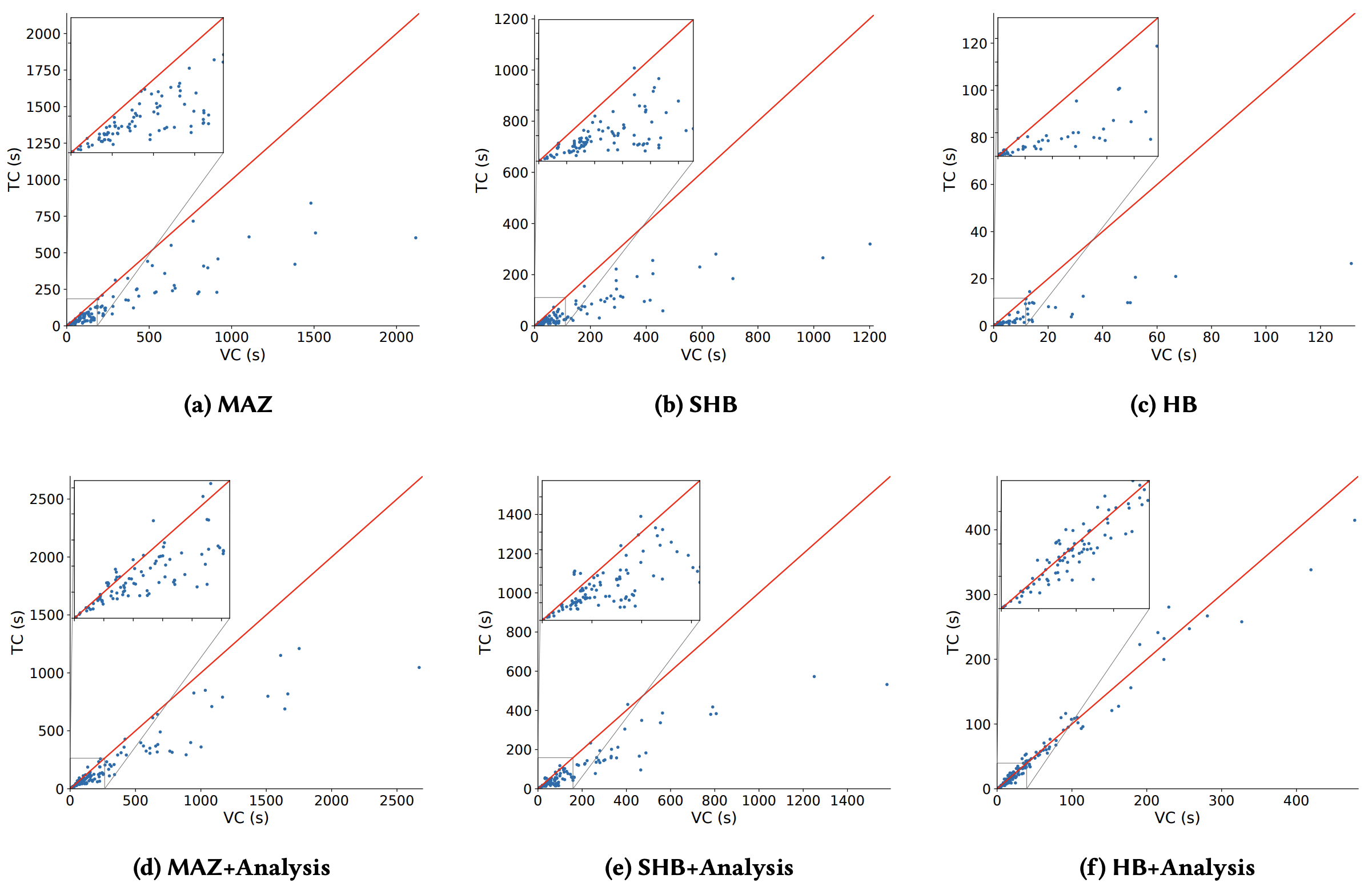 Figure 6 はすべてのベンチマークにおけるツリークロック時間とベクトルクロック時間の詳細を示している。ツリークロックのほとんどがすべての半順序でベクトルクロックを上回っており、場合によっては大幅にパフォーマンスが優れていることが分かる。興味深いことにより負荷の高いベンチマーク (つまりより時間がかかるベンチマーク) において高速化がより大きくなる傾向がある。ごく希にツリークロックが遅くなる場合もあるがそれはほんの小さな要因によるものである。それらはツリークロックの劣線形更新がわずかな改善の可能性しか得られないトレースであり、(ベクトルとは対照的な) より複雑なツリー構造を維持するオーバーヘッドを正当化するものではない。とはいえ全体的なツリークロックは MAZ, HB, SHB のそれぞれに一貫して十分な高速化をもたらしている。最後の、これらの高速化はすべてそれぞれの半順序を計算するアルゴリズムやデータ構造との相互作用を最適化することなく、基礎となるデータ構造を置き換えるだけで直接得られることを指摘しておく。