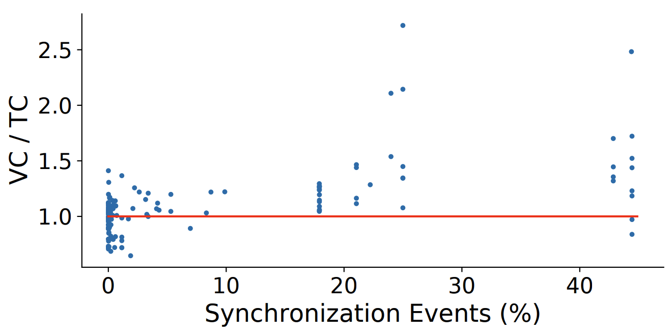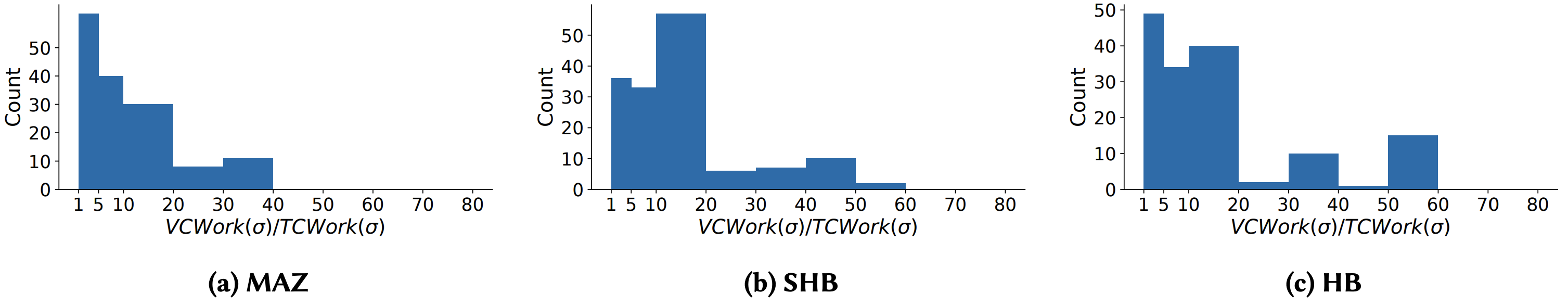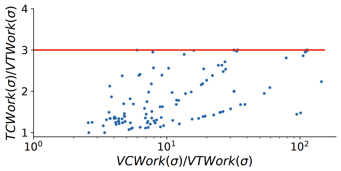 ベクトル時間作業との比較. 我々は各データ構造を使用して更新されたエントリの総数も調査した。メトリクス \({\rm VTWork}(\sigma)\) (セクション 4) は HB 半順序を計算するときにベクトル時間の任意の実装が実行しなければならない更新の最小量を測定することは以前に述べた。同様にデータ構造ツリークロックとベクトルクロックをそれぞれ使用する場合、各イベントの処理時に更新されるエントリの数に対応するメトリクス \({\rm TCWork}(\sigma)\) と \({\rm VCWork}(\sigma)\) を定義できる。これらのメトリクスはベンチマークスイートで HB 半順序を計算するために Figure 8 で可視化されている。この図から \({\rm VCWork}(\sigma)/{\rm VTWork}(\sigma)\) 比がかなり大きいことを示している。対照的に \({\rm VCWork}(\sigma)/{\rm VTWork}(\sigma)\) 比は通常かなり小さくなる。ベクトルクロックとツリークロックの間の実行時間の違いは \({\rm TCWork}(\cdot)\) と \({\rm VCWork}(\cdot)\) 間の不一致を反映している。次に、ツリークロックの最適性 (定理 1)、つまり \({\rm TCWork}(\sigma) \le 3 \cdot {\rm VTWork}(\sigma)\) の背後にある直感を以前に述べた。Figure 8 は \({\rm TCWork}(\sigma)/{\rm VTWork}(\sigma)\) 比が 100 近くまで増加している一方で、\({\rm TCWork}(\sigma)/{\rm VTWork}(\sigma)\) 比が 3 の上限に収まっていることから、この理論的境界を裏付けている。さらに一歩進んで Figure 9 はデータセット内の各半順序の \({\rm VCWork}(\sigma)/{\rm TCWork}(\sigma)\) 比を示している。結果は、ベクトルクロックがツリークロックに比べて不要な作業を多く行っていることを示しており、ツリークロックの高速化の原因を実験的に示している。Figure 9 は高速化の可能性が高い (55 倍に達する) ことを示しているが、1 回のツリークロック演算は 1 回のベクトルクロック演算よりも計算量が多いため、我々の実験 (Figure 6) での実際の高速化はより小さいものになる。