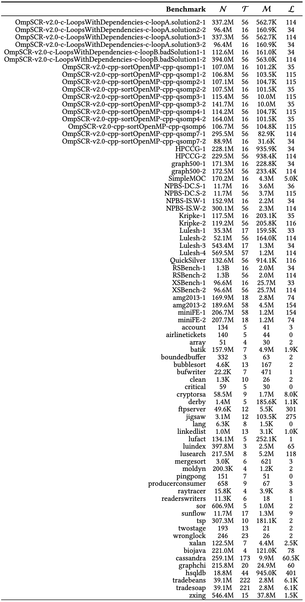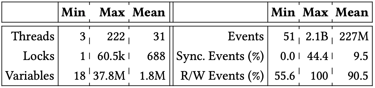 ベンチマーク. 我々のベンチマークセットはベンチマークスイートおよび最近の文献に見られる標準的なベンチマークで構成されている。特に IMB Contest suite [19]、Java Grande suite [60]、DaCapo [9]、SIR [16] の Java ベンチマークを使用した。さらに DataRaceOnAccelerator [54]、DataRaceBench [33]、OmpSCR [17]、および NAS parallel benchmark [6] からの実行時間とスレッド数が調整可能な OpenMP ベンチマークプログラムと、CORAL [1, 2]、ECP proxy application [3]、Mantevo project [4] のベンチマークスイートを含む大規模 OpenMP アプリケーションを使用した。各ベンチマークは RV-Predict [51] (Java プログラム用) および ThreadSanitizer [56] (OpenMP プログラム用) ツールを使用して単一の並行トレースをログに記録するために計測および実行された。全体としてこのプロセスにより評価に使用した 153 個のベンチマークトレースの大規模なセットが得られた。生成されたベンチマークトレースに関する集約情報を Table 1 に示す。個々のトレースに関する情報は Appendix C の Table 3 に記載されている。