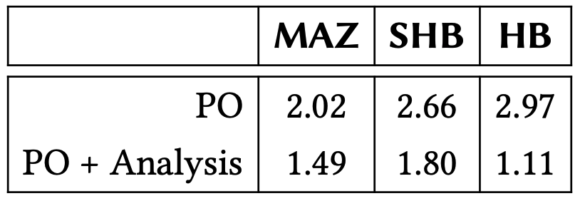 セットアップ. 各トレースはツリークロックと標準ベクトルクロックの両方を使用して MAZ, SHB, HB の各半順序を計算するために処理された。これにより本論文の目的である、それぞれの半順序を計算する際にツリークロックによってもたらされる高速化を直接観測することができる。