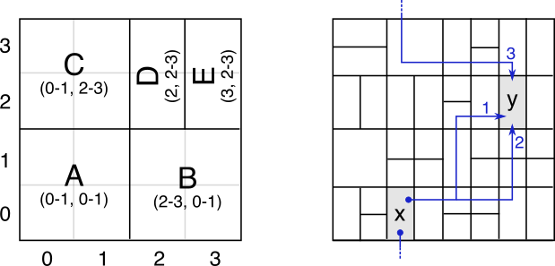 CAN (content addressing network) は \(d\) 次元直交座標系にノードを配置し、その幾何学的経路によるルーティングを行う分散ハッシュテーブル。各ノードは座標系の上に領域が割り当てられ、それぞれのノードは隣接する領域のノードのみしか参照しないため定数次数のグラフとみなすことができる。