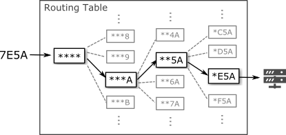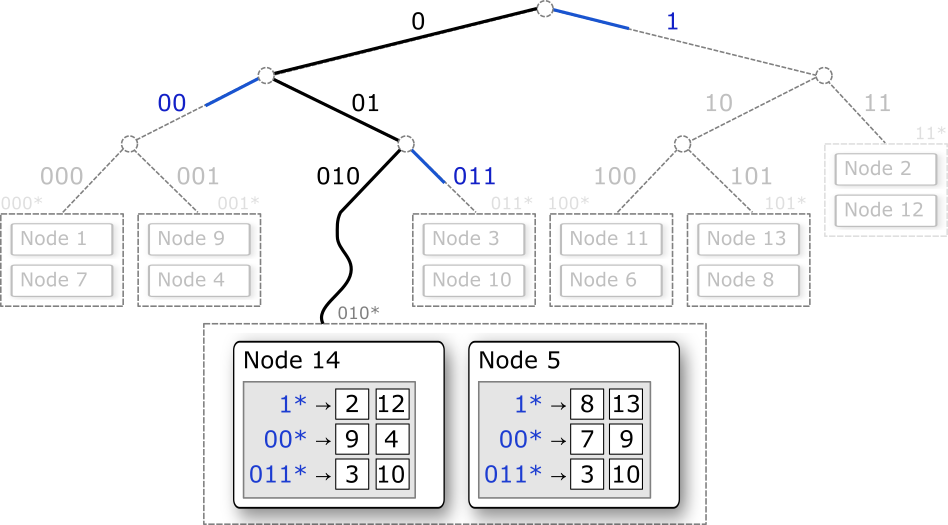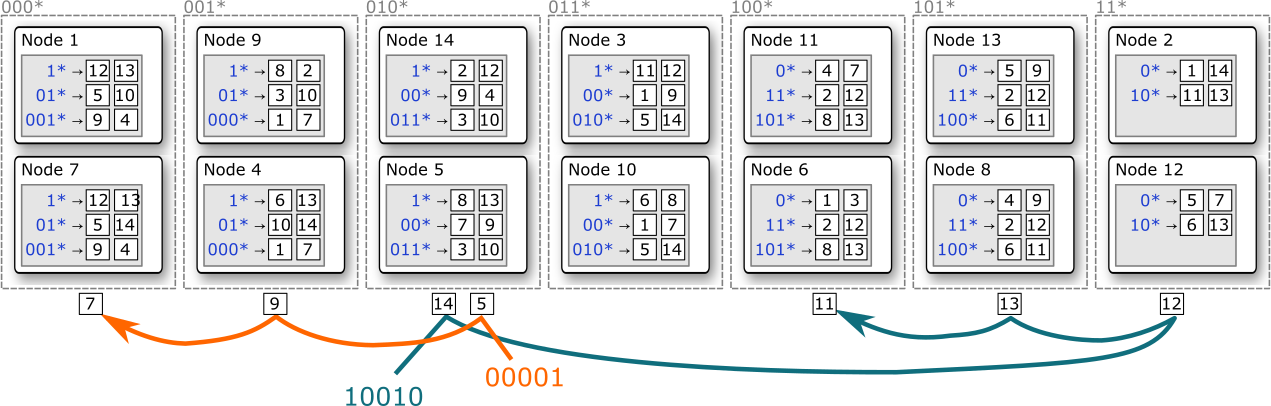 それぞれのノードが持つルーティングテーブルは、二分木の根からそのノードに到達するまでに分岐した枝の Prefix と、それら枝の先に存在するノードを (経路を多重化する場合は複数) マッピングしている。葉として多重化されているノードは同じノードへのリンクでもよい。