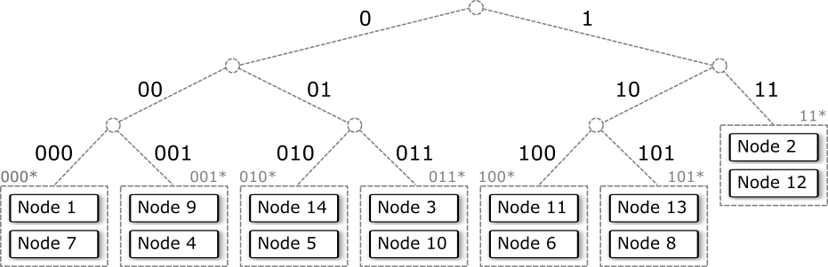) 構造に抽象化されるため目的のノードに \(O(\log N)\) ホップで到達することができる。また近い Prefix を担当するノードは比較的近い距離でリンクされていることから探索木の部分木をトラバースする経路でレンジクエリー (キーの範囲指定クエリー) が可能であることも多い。