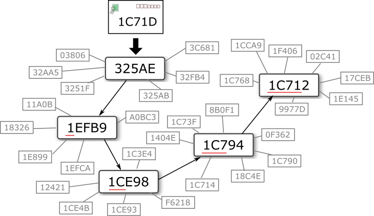 325AE から始まる 1C71D 宛のメッセージルーティングのイメージ。このイラストではノード 1C712 が 1C71D を担当してるため 4 ホップで到達する。