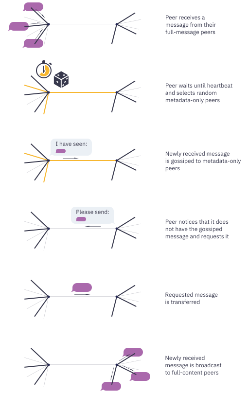 我々の研究に近いものは Vitis [29], Tera [13], Rappel [27], StAN [26] などのシステムである。これらは情報を伝播するために Gossip を使用し非構造化 P2P オーバーレイを構築する。Gossip ベースのプロトコルはフルメッセージ (full message) とメタデータピアリング (metadata peering) の 2 つの種類のピアリングを区別する (Fig 3 と Fig 4 を参照)。2 つのノードがフルメッセージピアリングの場合、一方のノードが受信したメッセージはそのフルメッセージピアに転送される。対照的に、2 つのデータがメタデータピアの場合、受信したメッセージのメタデータのみを交換する。メタデータピアは Publish されたメッセージを "認識" (aware) しているが実際には Publish されたメッセージを持っていない。gossipsub はメタデータピアリングの概念を拡張して、以前に提案された遅延プッシュの概念を実装している。この概念にしたがってネットワーク内のピアはメッセージの存在のみを (例えばメッセージ ID を通じて) 通知されるが、ノードが新しく公表されたメッセージを明示的に要求したときにのみメッセージは転送される。