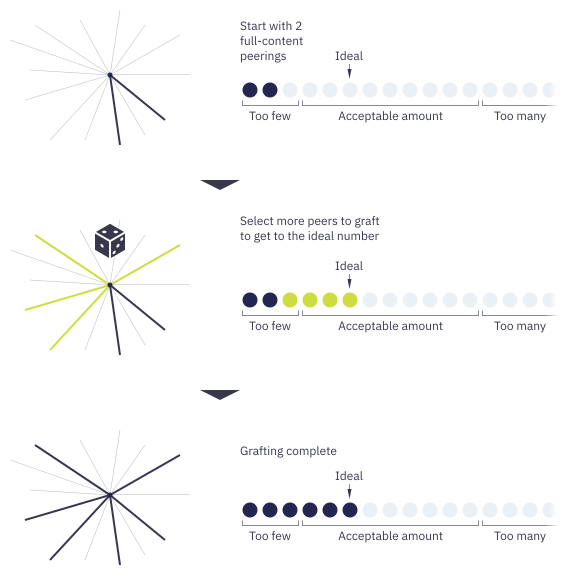オーバーレイは最初トピックのみに基づいてランダムな方法で構築される。ピアがトピックに参加するたびに (トピック内の) \(D\) 個のピアをランダムに選択してメッシュに追加し、制御メッセージで通知する。トピックを離れるときはそのピアに通知し、トピックのメッシュを忘却する。
