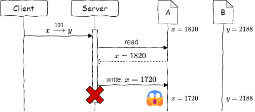 WAL はコンピュータ上での非アトミックな操作に対して障害耐性をもたらす。例えば、複数のファイルに渡る操作はアトミックに行うことができないことから、ファイル \(A\) に保存されている \(x\) の値から、ファイル \(B\) に保存されている \(y\) の値へ、量 100 を移動する操作について考えてみよう。ファイルはノードに置き換えても良い。