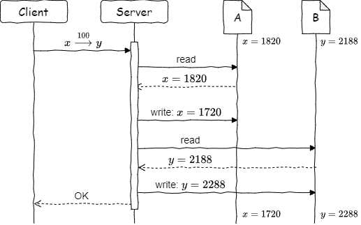 この操作を単純に実装するなら、ファイル \(A\) を読み込んで \(x\) から 100 を減算した値で更新した後に、ファイル \(B\) を読み込んで \(y\) に 100 を加算した値で更新することができるだろう (Figure 1)。