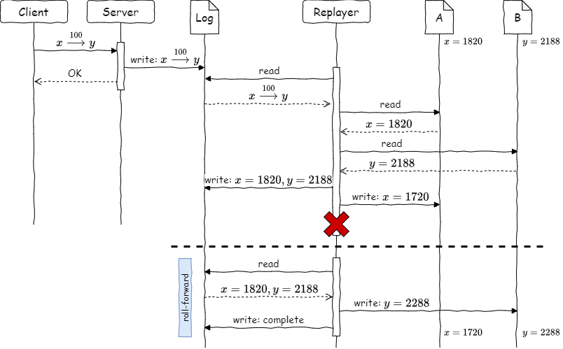 このような不整合が起きることを防ぐために WAL を使うことができる。プロセスはまず操作を WAL に書き込む (これは単一書き込みなのでアトミックに実装できる)。WAL への書き込みが完了すると Replayer プロセスがそれを読み込んで実行する。このとき、更新中にシステムがクラッシュしてもデータを一貫した状態に復元するのに十分な情報をログに記録しておく。例えば Figure 3 では \(x\) と \(y\) の値をログに記録しておくことで、Replayer が \(x\) を書き込んだ直後にシステムがクラッシュしても、システムの再起動後にログを読み込んで各トランザクションの進捗状況を確認して処理途中の操作を完了することができる。