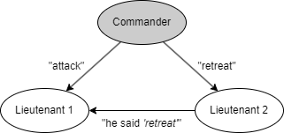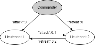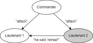 ここで、口伝のメッセージでは 3 将軍解 (three-general solution) で 1 人の裏切り者も対処できないことを示す。簡単のために "攻撃" (attack) か "退却" (retreat) しか判断できない場合を考える。まず Fig. 1 に描かれているシナリオについて考える。このシナリオでは Commander は忠実で "攻撃" 命令を送信するが、Lieutenant 2 は裏切り者で Lieutenant 1 に "退却" 命令を受けたと報告する。IC2 を満たすためには Lieutenant 1 は攻撃の命令に従わなければならない。