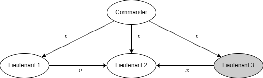 このアルゴリズムがどのように機能するかを理解するために \(m=1\), \(n=4\) のケースを考える。Fig. 3 は Lieutenant 3 が裏切り者で Commander が値 \(v\) を送信したときに Lieutenant 2 が受信するメッセージを示している。\({\rm OM}(1)\) の最初のステップでは司令官が 3 人の副官全員に \(v\) を送信する。次のステップで Lieutenant 1 は自明なアルゴリズム \({\rm OM}(0)\) を使って Lieutenant 2 に値 \(v\) を送信し、また同じステップで裏切り者の Lieutenant 3 は Lieutenant 2 に別の値 \(x\) を送信する。ステップ 3 では Lieutenant 2 は \(v_1=v_2=v\) と \(v_3=x\) となり、正しい値 \(v={\rm majority}(v,v,x)\) を得ることができる。