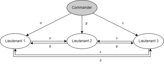 条件 1' と条件 2 は \(i\) 番目の将軍によって送信された単一の値に関する条件である。したがって、一人の将軍がどのように他の将軍に自分の値を送るかという問題に限定して考えることができる。これを司令官 (commander) である将軍が副官 (lieutenant> に命令を送るという言葉で表現すると次のような問題が得られる。