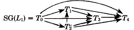 \(L\) を \(\{T_0,\ldots,T_n\}\) 上のログとする。\(L\) の直列化グラフ (serialization graph) \(SG(L)\) は、ノードが \(T_0,\ldots,T_n\) で構成され、辺がすべて \(T_i \to T_j\) (\(i \ne j\)) の有向グラフである。ここで \(T_i\) における何らかの操作が \(T_j\) における何らかの操作よりも前に発生し、かつ競合する関係にある。例えばログ \(L_1\) の直列化グラフは