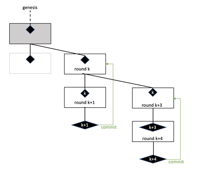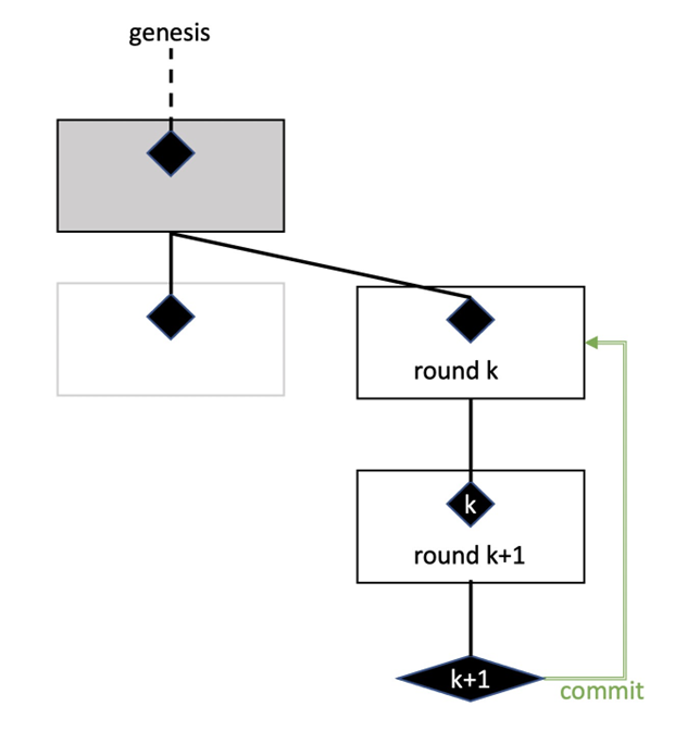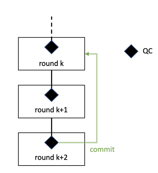 ラウンド数は明示的にブロックに含まれ、その結果コミットロジックはシンプルになる: 最後の子孫が認証されたラウンド番号を持つ連続した 2-chain が必要である。2 つのラウンドが途切れることなく終了すると、QC を形成した連続する 2 つのラウンドからなる "2-chain" の先頭がコミットされる。Figure 1 の図を参照。