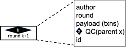 ブロック. コンセンサスプロトコルが台帳トランザクションの合意を形成するために使うコアデータ構造は Block である。各ブロックは提案された Ledger トランザクションと、コンセンサス決議を形成するために使用される追加情報が payload として含まれている。各ブロック b (既知のジェネシスブロック P0 を除く) は b.qc を介して親に連結される。ここで b.qc は親ブロックに対する定足数の投票で構成される定足数証明書 (QC) である。このようにしてコミットメント待ちのブロックは P0 をルートとする提案ブロックのツリーを形成する。