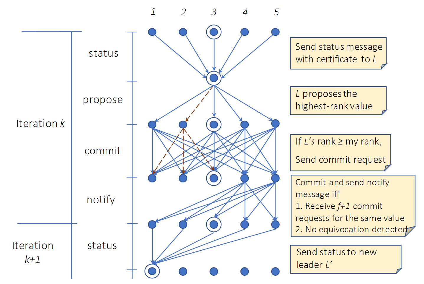 理想的には、リーダーが誠実であればその反復の最後に \(v\) に対する \(f+1\) 票を受け取った時点で \(v\) をコミットする。ビザンチンのリーダーは鄭亜案しないことで簡単にその反復を無駄にすることができる。しかし次のようなより巧妙な攻撃を実行することもできる: (1) 矛盾する提案を別々の誠実者に送る、または (2) 提案を一部の誠実な当事者に送信するが、すべての当事者には送信しない。このようなビザンチン的な振る舞いが安全性を損なわないようにしなければならない。