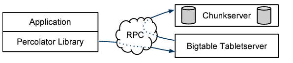 Percolator システムはクラスタ内のすべてのマシンで実行される、Percolator ワーカー、Bigtable [9] タブレットサーバ、GFS [20] チャンクサーバの 3 つのバイナリで構成される。すべてのオブザーバは Percolator ワーカーにリンクされており、Percolator ワーカーは Bigtable をスキャンして変更されたカラム ("通知") を探し、対応するオブザーバをワーカープロセスの関数コールとして呼び出す。オブザーバは Bigtable タブレットサーバに読み取り/書き込み RPC を送信することでトランザクションを実行し、Bigtable タブレットサーバは GFS チャンクサーバに読み取り/書き込み RPC を送信する。このシステムはタイムスタンプオラクル (timestamp oracle) と軽量ロックサービス (lightweight lock service) という 2 つの小さなサービスにも依存している。タイムスタンプオラクルは厳密に増加するタイムスタンプを提供する。この特性はスナップショット分離プロトコルを正しく動作させるために必要である。ワーカーはダーティ通知の検索を寄り効率的に行うために軽量ロックサービスを使用する。