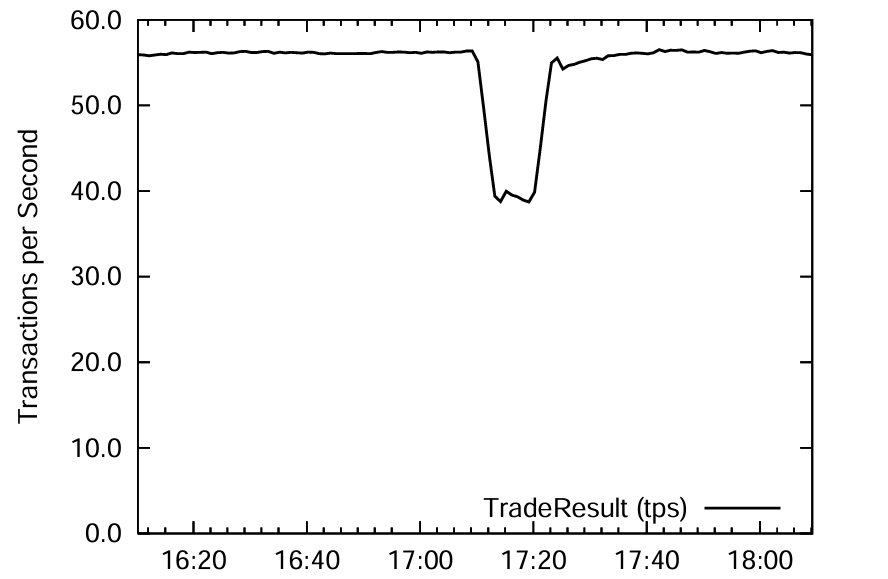 CPU のインフレ要因はレイヤーリングのコストである。その代わり、スケーラビリティ (TPC-E と直接比較sることはできないが、我々の最速の結果は現在の公式記録 [33] の 3 倍以上) が得られ、障害に対する回復力など、我々が構築したシステムの有用な機能を継承することができる。後者を実証するために 15 台のタブレットサーバでベンチマークを実行し性能が安定するまで待った。Figure 10 はシステムのパフォーマンスの経時変化を示している。17:09 の性能低下は障害イベントに対応しており、我々はタブレットサーバの 1/3 を停止した。障害イベントの直後にパフォーマンスが低下するが、タブレットが他のタブレットサーバによって再ロードされると回復する。停止したタブレットサーバを再起動できるようにしたため、パフォーマンスは最終的に元のレベルに戻った。