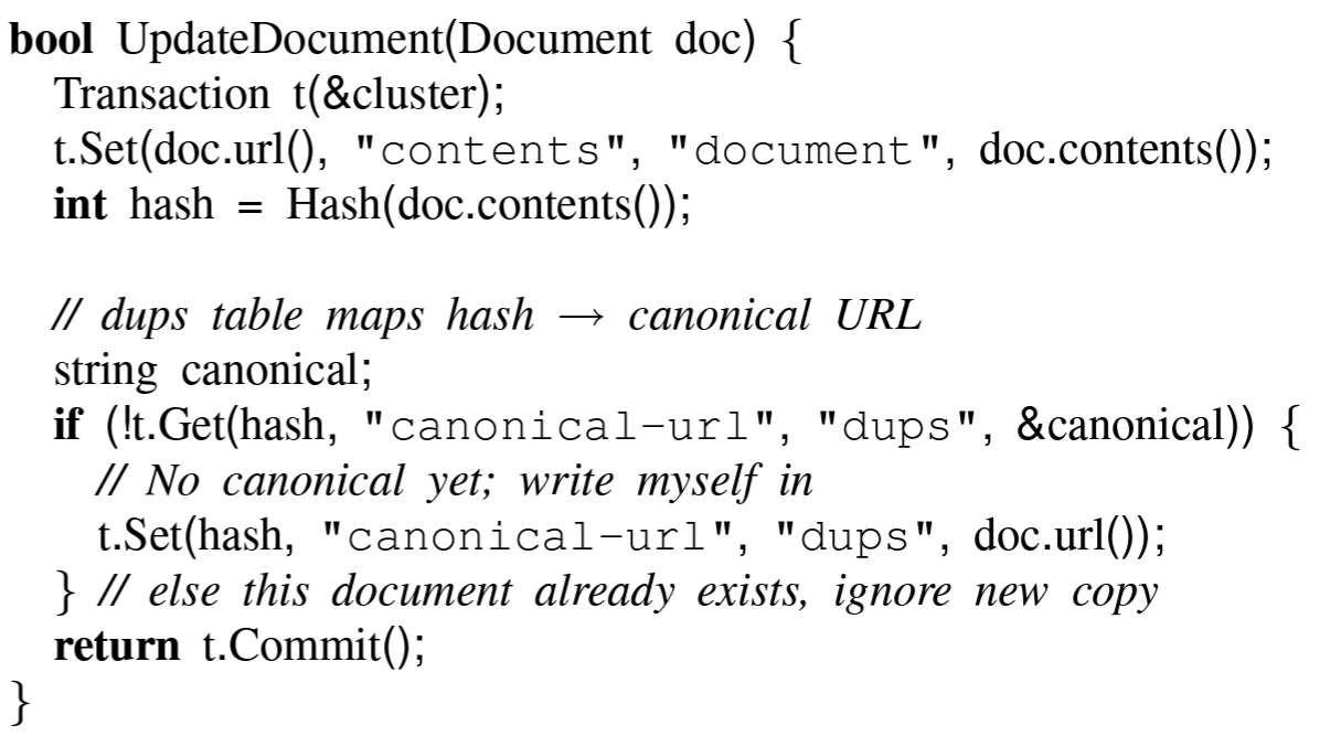 Percolator は ACID スナップショット分離セマンティクスを備えた、行間、テーブル間のトランザクションを提供する。Percolator ユーザはトランザクションコードを命令型言語 (現在は C++) で記述し、コードに Percolator API への呼び出し混在させる。Figure 2 はコンテンツのハッシュによる文書クラスタリングの簡略版を示している。この例では Commit() が false を返した場合、トランザクションは競合しており (この場合は同じコンテンツハッシュを持つ 2 つの URL が同時に処理されたため)、バックオフの後に再試行する必要がある。Get() と Commit() の呼び出しはブロッキングであり、並列処理はスレッドプールで多数のトランザクションを同時に実行することによって実現される。