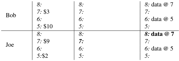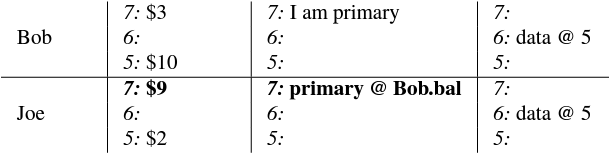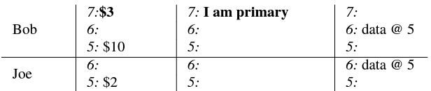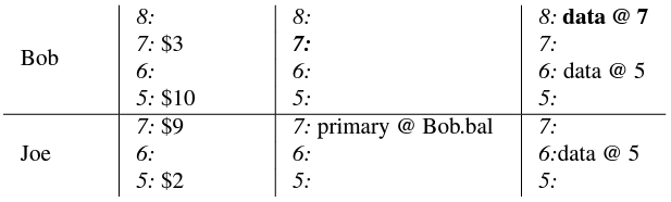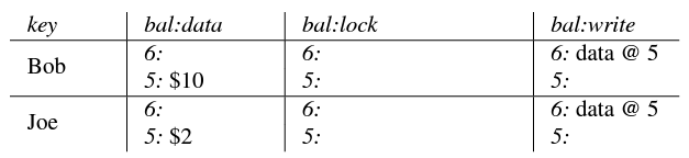 3. このトランザクションは Joe のアカウントをロックして Joe の新しい残高を書き込む (ここでも開始タイムスタンプで)。このロックはトランザクションのセカンダリであり、(行 "Bob", 列 "bal" に格納されている) プライマリロックへの参照を含んでいる。クラッシュによりこのロックが取り残された場合、ロックをクリーンアップしたいトランザクションは、クリーンアップを同期させるためにプライマリの場所を必要とする。