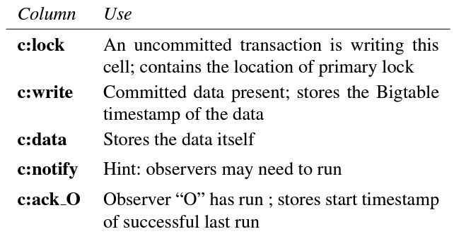 Bigtable 上に構築するという決定により Percolator の全体的な形状が定義された。Percolator は Bigtable のインターフェースの要点を維持しており、データは Bigtable の行と列に整理され、Percolator のメタデータは特別な列に格納される (Figure 5 参照)。Percolator の API は Bigtable の API によく似ている。Percolator ライブラリは主に Percolator 固有の計算でラップした Bigtable 操作で構成されている。したがって Percolator を実装する歳の課題は Bigtable にはない多行トランザクションとオブザーバフレームワークの機能を提供することである。