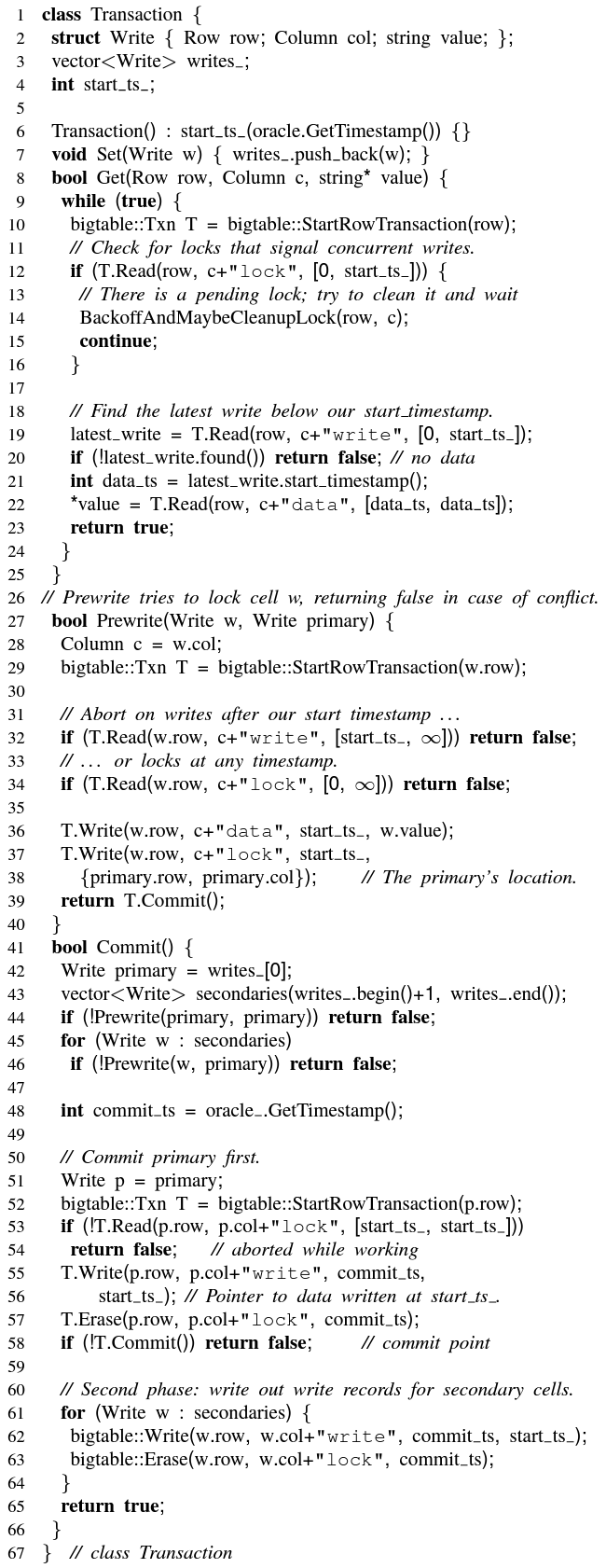 コミットの最初のフェーズ ("事前書き込み") では書き込み中のすべてのセルをロックしようとする (クライアントの障害を処理するために 1 つのロックを任意にプライマリとして指定する; このメカニズムについては後述)。トランザクションはメタデータを読み取り、書き込まれる各セルの競合をチェックする。競合するメタデータには 2 種類ある。トランザクションがその開始タイムスタンプの後に別の書き込みレコードを検出するとトランザクションは中止する (32行目)。これはスナップショット分離が防御する write-write 競合である。トランザクションが任意のタイムスタンプで別のロックを検出した場合もトランザクションを中止する (34行目)。他のトランザクションが我々の開始タイムスタンプより前にコミットした後にロック解放が遅れているだけの可能性もあるが、我々はその可能性は低いと考えて中止する。競合がなければ、開始タイムスタンプの各セルにロックとデータを書き込む (36-38行目)。