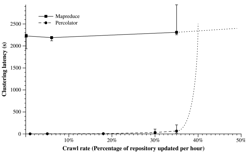 クロールレートが増加すると MapReduce の処理時間もそれに応じて増加する。理想的には、リポジトリと、クロールレートと共に増加する入力を合わせたサイズに比例するだろう。実際にはこのような小さな MapReduce の実行時間ははぐれものによって制限されるため、処理時間の増加 (ひいてはクラスタリングのレイテンシ) は、低いクロールレートではクロールレートとほとんど相関しない。例えば 6% のクロールレートでは 1 TB のデータセットに 150 GB しか追加されず、150 GB を処理するための余分な時間はノイズである。クロールレートが増加しても Percolator のレイテンシは比較的変化しないが、クロールレートが 1 時間あたり 40% になるとレイテンシは突然実質的に無限に増加する。この時点で Percolator はテストクラスタのリソースを飽和させ、クロールレートに対応できなくなり、未処理の文書の無制限のキューを構築し始める。40% の点線の漸近線はこの限界点を超えた Percolator のパフォーマンスの外挿である。MapReduce も同じ影響を受ける。最終的に、クロールされた文書は MapReduce がそれらをクラスタリングできる速度よりも速く蓄積され、その後の実行でバッチサイズが際限なく増加する。しかし、この特定の構成では MapReduce は 100% を超えるクロールレートを維持することができる (点線はパフォーマンスを外挿したものである)。