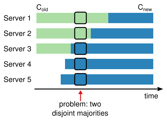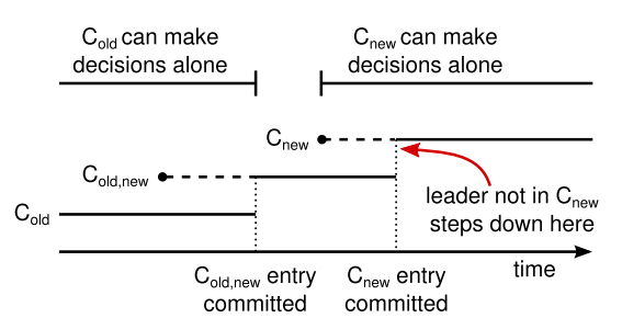 メンバーシップの変更: Raft のメカニズムはクラスタ内のサーバセットを変更するために、移行中に 2 つの異なる構成の大部分が重複するという新しい連結コンセンサス (joint consensus) アプローチを使用する。これによりクラスタは構成変更中でも正常に動作し続けることができる。