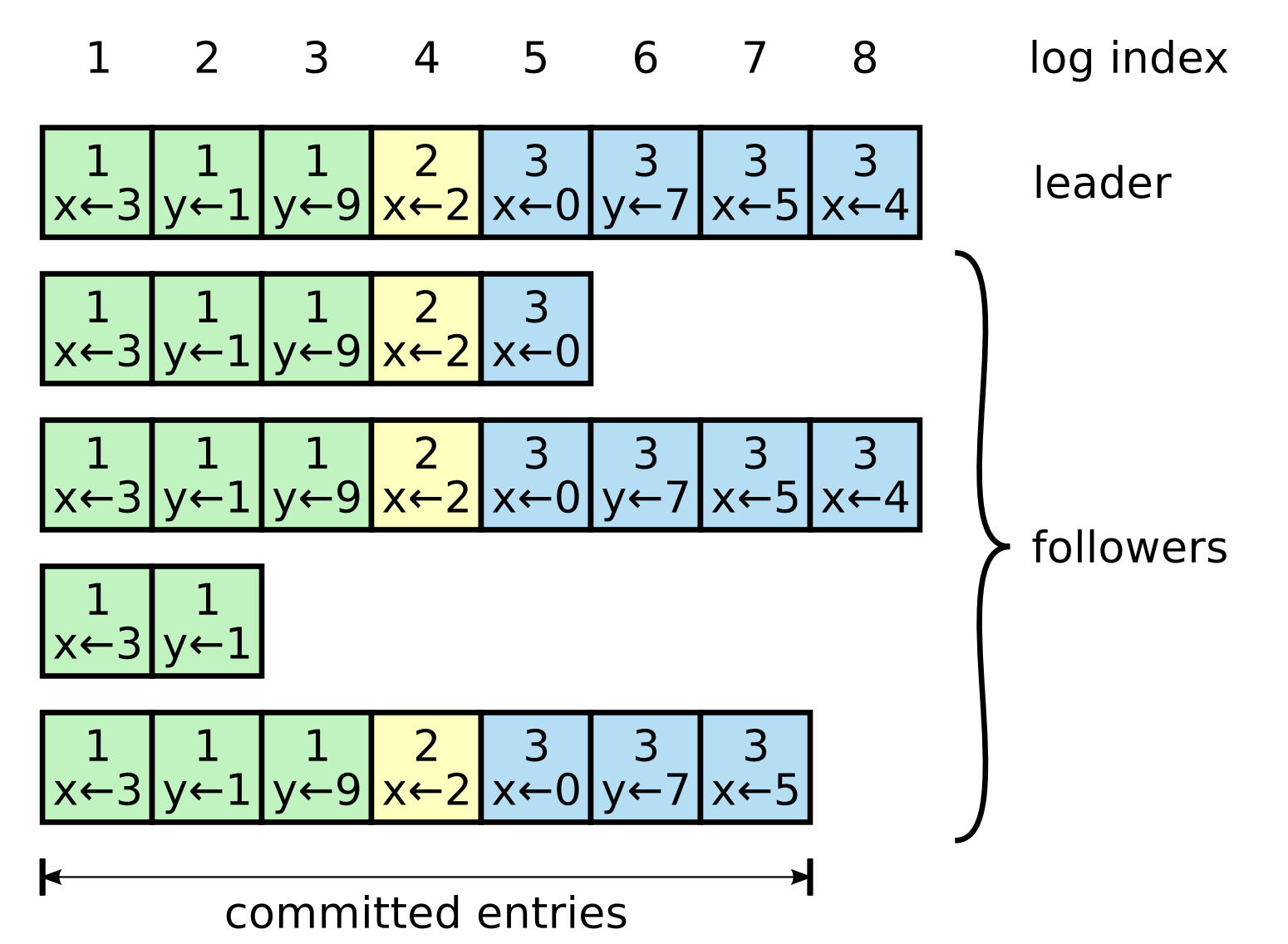 | matchIndex[] | 各サーバに対して、そのサーバで複製されていることが分かっている最も大きいログエントリのインデックス (0に初期化され単調増加)。 |