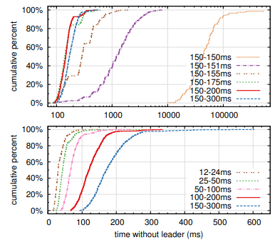 Figure 16 の上側のグラフは、選挙タイムアウトにおける少量のランダム化が選挙において分割投票を回避するのに十分であることを示している。ランダム性がない場合、我々のテストではたくさんの分割投票のためにリーダー選挙は一貫して 10 秒より長くかかった。わずか 5ms のランダム性を追加するだけでダウンタイムの中央値は 287ms になった。よりランダム性を使用すると最悪ケースの動作が改善される。ランダム性が 50ms の場合、最悪ケースの完了時間 (1000 以上のトライアル) は 513ms だった。