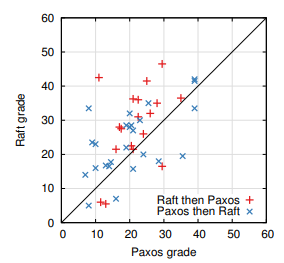 我々はまた未知の学生のクイズスコアを三つの要因に基づいて予測する線形回帰モデルを作成した: 彼らがどのクイズを取ったか、彼らの過去の Paxos 経験の程度、および彼らがアルゴリズムを学んだ順序である。このモデルはクイズの選択が Raft に有利な 12.5 ポイント差を生むと予測している。これは観測された 4.9 ポイントの差よりも有意に高く、実際の学生の多くが過去に Paxos を経験しており、それが Paxos をかなり助けたのに対して、Raft もわずかに助けている。奇妙なことにこのモデルではすでに Paxos のクイズを受けた人の Raft スコアが 6.3 ポイント下がると予測している; 理由は不明だが統計的に有意であると思われる。