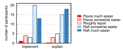 この研究の成果が Raft と呼ばれるコンセンサスアルゴリズムである。Raft の設計では、分解 (Raft はリーダー選挙、ログ複製および安全性を分離する) や空間状態の縮小 (Raft は Paxos と比較して非決定性の程度とサーバが互いに矛盾を起こしうる手段を減らしている) など、分かりやすさ向上させるための特定の手法を適用した。2 つの大学の 43 人の学生を対象としたユーザ調査では Paxos よりも Raft の方がはるかに理解しやすいことがわかった。