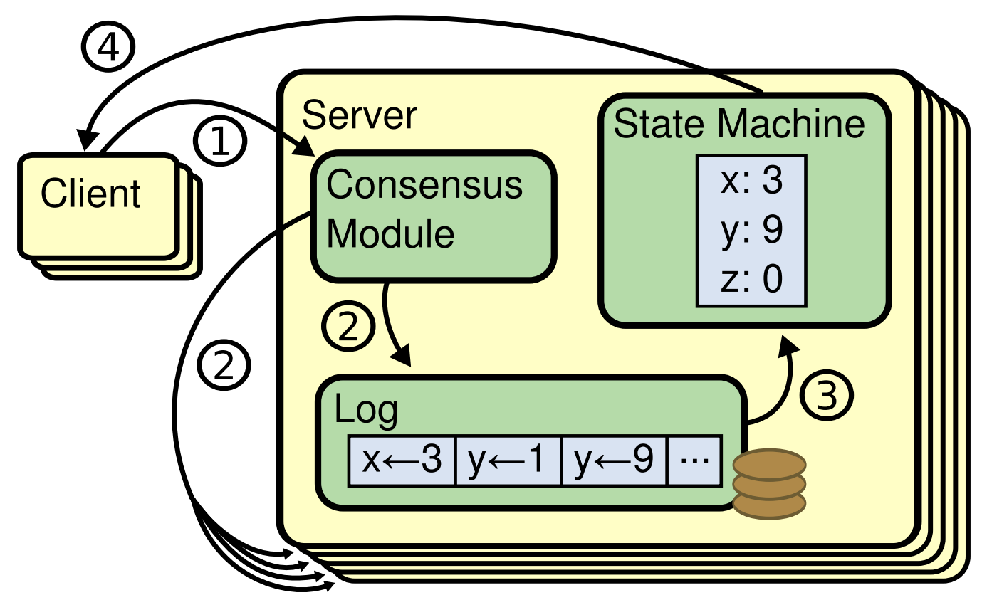 複製されたログの一貫性を保つことがコンセンサスアルゴリズムの仕事である。サーバ上のコンセンサスモジュールは、クライアントからコマンドを受け取りそれらをログに追加する。他のサーバ上のコンセンサスモジュールと通信し、一部のサーバで障害が発生した場合でも最終的にすべてのログに同じリクエストが同じ順序で含まれるようにする。コマンドが正しく複製されると、各サーバのステートマシンはログの順序どおりにそれらを処理し、出力がクライアントに返される。結果としてサーバは単一の信頼性の高いステートマシンを形成するように見える。