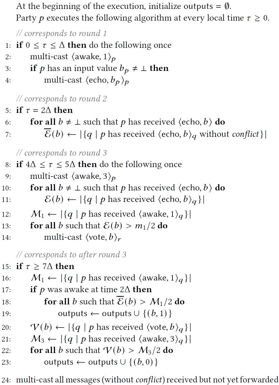 タイムシフトクォーラム. タイムシフトクォーラム (time-shifted quorum) と呼ぶ新しい手法を導入する。ラウンド 1 では、各当事者はその入力値に対する echo メッセージと、ラウンド 1 に対する awake メッセージを送信する。各当事者は \(\mathcal{E}(b)\) で示される任意の値 \(b\) の echo 数と、\(\mathcal{M}_1\) で示されるラウンド 1 の認知している参加者レベルを追跡する。この 2 つの変数は時間とともに変化する可能性があることに注意。ラウンド 3 においてある当事者が値 \(b\) に対する過半数の echo、つまり \(\mathcal{E}(b) \gt \mathcal{M}_1/2\) を観測した場合は \(b\) に投票する。最後に、ラウンド 3 の後、時刻 \(\Delta\) までに受信した echo の数がまだ過半数に達している、つまり \(\bar{\mathcal{E}}(b) \gt \mathcal{M}_1/2\) の場合、当事者はラウンド 3 で目を覚ましていたすべての誠実な当事者が \(b\) に投票したことを確信でき (これを次で証明する) \((b,1)\) を出力することができる。