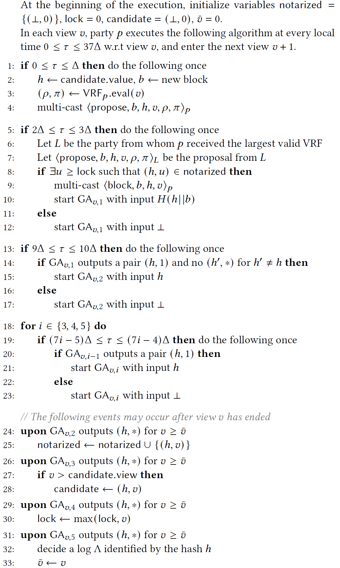 ビューベースの構築. 我々のプロトコルは標準的な view-by-view パラダイムに従っている。各ビューは \(37\Delta\) 時間続く。つまり、ビュー \(v\) はローカル時刻 \(37(v-1)\Delta\) に開始しローカル時刻 \(37v\Delta\) に終了する。(最初のビューは view 1 である。) 簡略化のためビューに対する相対時間を使用する。つまりビュー \(v\) のローカル時刻 \(\tau\) とはローカル時刻 \(37(v-1)\Delta+\tau\) を意味する。各ビューはおおよそ 2 つのフェーズで構成される。第一フェーズ (1-4 行目) では各当事者が VRF 抽選とともに提案する。第二フェーズ (5-23 行目) では選出されたリーダーからの提案が一連の段階的合意 (GA) インスタンスを通じて決定される。