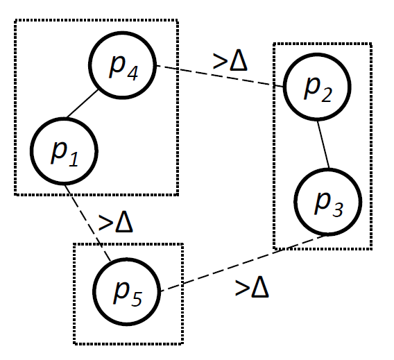 定義 1. (分断されたレプリカ) \(p\) がレプリカの最大の部分集合に含まれない場合、\(p\) は分断されている。部分集合内ではレプリカのすべてのペアは遅延 \(\Delta\) 内で互いに通信することができる。