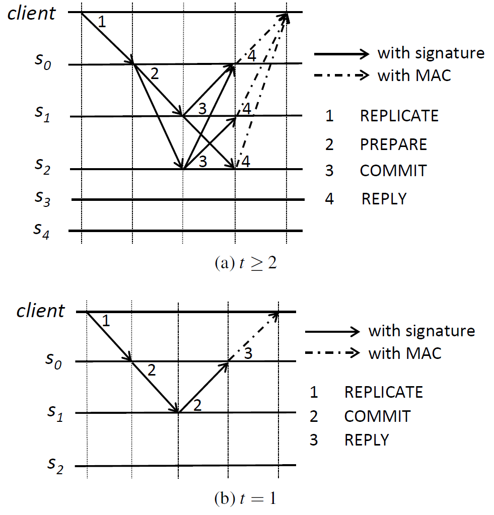通常ケース (セクション 4.2) では、クライアントは電子署名された要求をプライマリに送信し、それが \(t+1\) 個のアクティブレプリカに複製される。これらの \(t+1\) 個のレプリカは複製されたすべての要求の証明に電子的に署名しローカルの commit ログに記録する。commit ログはビュー変更の一貫性を維持するための基礎となる。