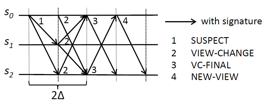 同期 BFT プロトコル (例えば [29]) は、正しいが分断されているレプリカの存在を考慮しない。このため非常に強い仮定が必要となる ─ そしてメッセージ認証に電子署名を使用する同期型 BFT プロトコル (いわゆる認証付きプロトコル) は非クラッシュ障害レプリカを \(n-1\) 個まで許容することができる。
