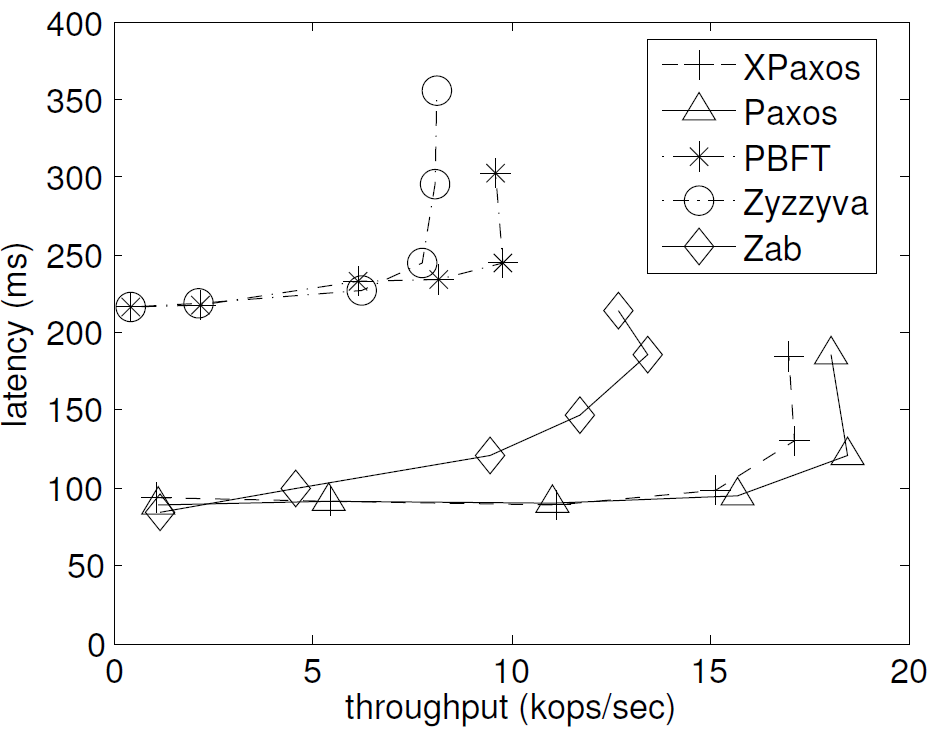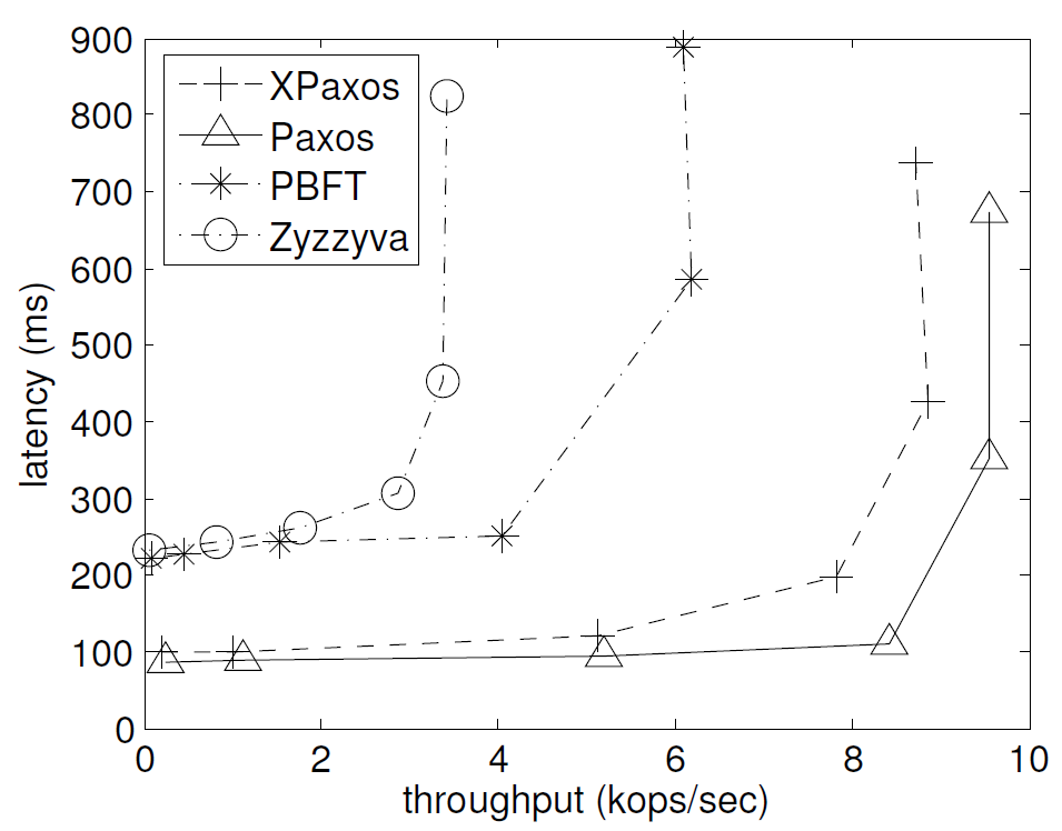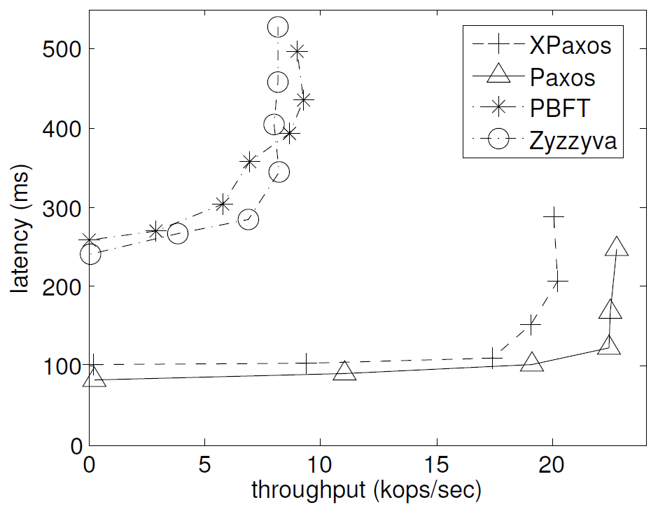 我々の研究が実際のアプリケーションに与える影響を評価するために、この研究で検討したすべてのプロトコル、Zyzzyva, PBFT, PAXOS, XPaxos を用いて ZooKeeper コーディネーションサービス [19] をレプリケーションしたときに達成された性能を測定した。また区仕込みの Zab プロトコル [20] を用いてシステムを複製したときの ZooKeeper 本来のパフォーマンスとの比較も行った。このプロトコルにはクラッシュ耐性があり、\(t\) 個の障害を許容するために \(2t+1\) 個のレプリカを必要とする。