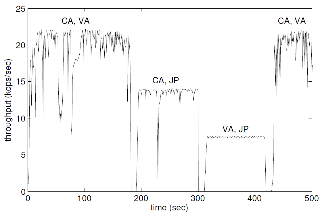 このセクションでは XPaxos のパフォーマンスを評価し、ワールドワイドなクラウドプラットフォームである Amazon EC2 を使って Zyzzyva [22]、PBFT [9]、WAN 向けに最適化された Paxos [27] と比較する。我々は XFT や BFT などのビザンチン障害耐性プロトコルに適していると考えて地理レプリケーションの WAN 設定を選択した。実際 WAN 設定では (i) マシン間をつなぐスイッチのような単一障害点がなく、(ii) 電力喪失、嵐、そのほかの自然災害による相関障害がなく、(iii) 敵対者がネットワークをフラッディングしネットワーク障害と非クラッシュ障害を相関させることが困難である (最後の点は XFP に関係している)。