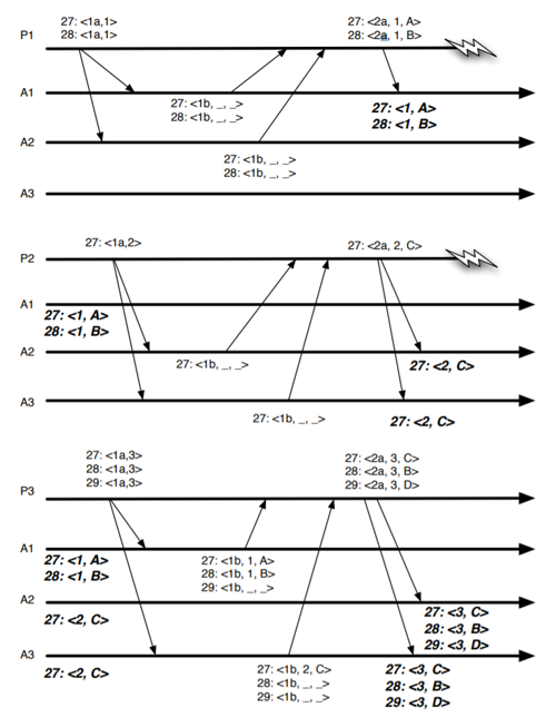 Fig 1 は我々の要件の下で Paxos に見つかった問題を示している。この図は 3 人の提案者がいるケースで、生成される状態変更の順序に関する我々の要求に違反した実行を示している。提案者 P1 はシーケンス番号 27 と 28 に対してフェーズ 1 を実行する。提案者 P1 は投票番号 1 のフェーズ 2 でシーケンス番号 27 と 28 に対してそれぞれ値 \(A\) と \(B\) を提案する。両方の提案はアクセプター A1 によってのみ受理される。提案者 P2 はアクセプター A2 と A3 に対してフェーズ 1 を実行し、投票番号 2 のシーケンス番号 27 に対してフェーズ 2 で \(C\) を提案するところに行きつく。最終的に提案者 P3 はフェーズ 1 とフェーズ 2 を実行し、定足数のアクセプターがシーケンス番号 27 に \(C\) を、シーケンス番号 28 に \(B\) を、29 に \(D\) を選択することができた。