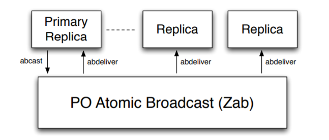 ZooKeeper のプライマリ-バックアップ方式を採用しており、リクエストの実行や状態変更を PO アトミックブロードキャストでバックアッププロセスに伝達する (Fig 2)。このためプライマリだけがブロードキャストを行うことができる。プライマリプロセスがクラッシュした場合、新しいプライマリを選択する外部のメカニズムが存在すると仮定する。しかし、ブロードキャストを許可されたアクティブなプライマリプロセスがどんな時でも最大 1 つまでしか存在できないことを保証することが重要である。我々の実装では、プライマリ選出のメカニズムはブロードキャスト層で使用するメカニズムと密接に結合している。仕様上は、常に最大で 1 つのプライマリがアクティブであることを保証するような、プライマリを選出するための何らかのメカニズムが存在すると仮定すれば十分である。時間が経過すると \(\rho_e \in \Pi\) となるようなプライマリの非拘束シーケンス \(\rho_1 \rho_2 \cdots \rho_e \rho_{e+1} \cdots\) を得る。\(e \lt e'\) であれば \(\rho_{e'} \prec \rho_e\)、プライマリ \(\rho_e\) はプライマリ \(\rho_{e'}\) に先行すると言う。プライマリが先行するとは、時間の経過とともにプライマリとなるプロセスの順序を意味する。実際にはプロセスは回復することができるため、\(\rho_e\) と \(\rho_{e'}\) が同じプロセスであるが異なるインスタンスを参照しているような \(e \ne e'\) の \(\rho_e\) と \(\rho_{e'}\) が存在することもある。