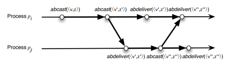 因果順序の定義はイベントの優先順位 (precedence) (または happens before) 関係に基づいている [14]。ブロードキャストプロトコルでは、イベントはブロードキャストか受け取りのどちらかである。\({\it abcast}(\langle v,z\rangle)\) が \({\it abcast}(\langle v',z'\rangle)\) に先行することを \(\langle v,z\rangle \prec_c \langle v',z'\rangle\) と表すことにする。アトミックブロードキャストプロトコルの因果順序特性は、典型的に以下のように定義される (Défago ら [13] の定義から採用):